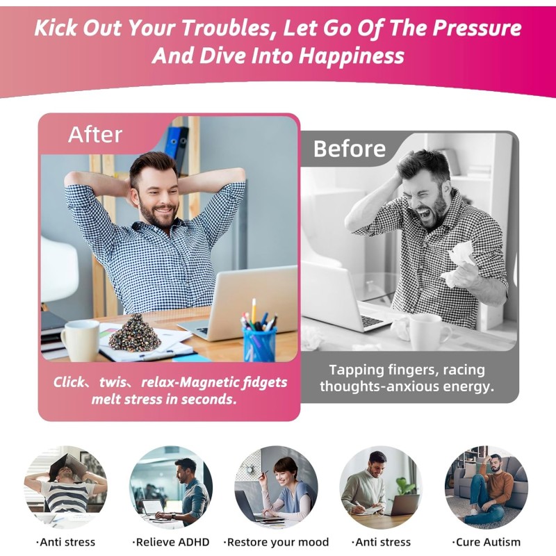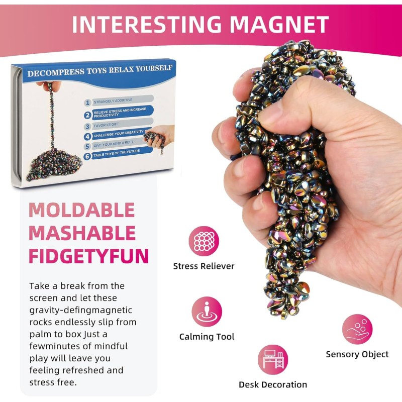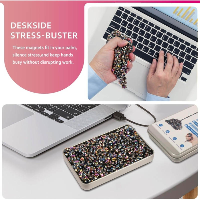 - 【Fidget Toys for Anxiety】Each set of fidget toys has over 550 ferrite stones in a metal tin. You can gab the right account according to your hands, mash ‘em, mold ‘em, stack ‘em, Or make various shapes. These desk toys can not only effectively improve concentration, but also effectively relieve stress and anxiety. When you need to deal with boring occasions, just put them in the palm of your hand to relieve irritability and boredom.