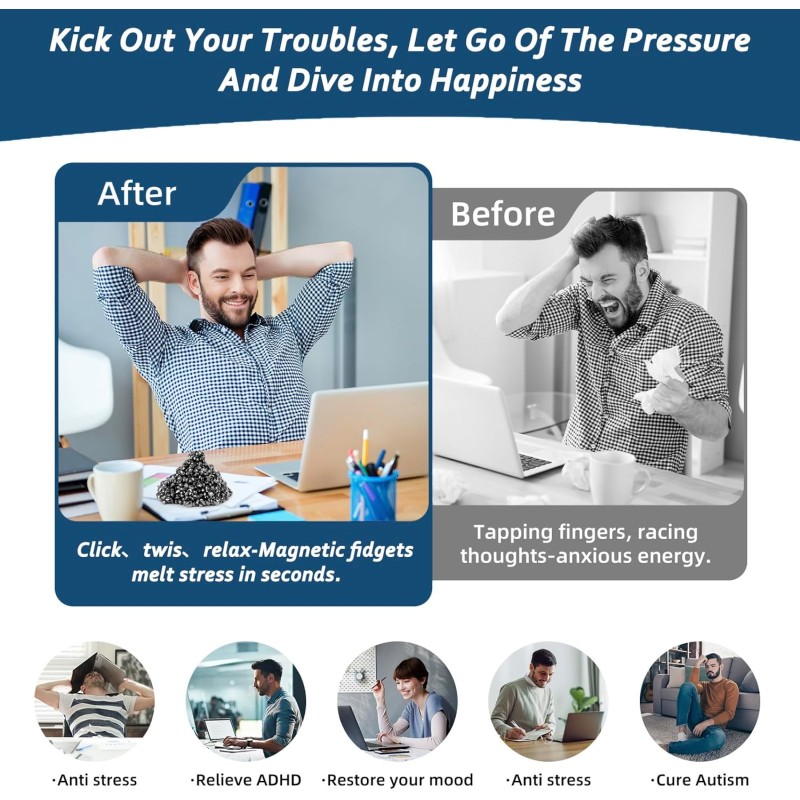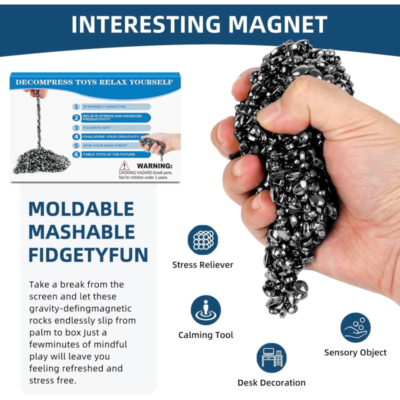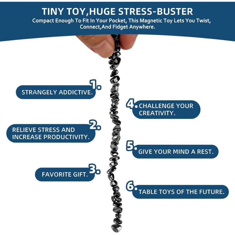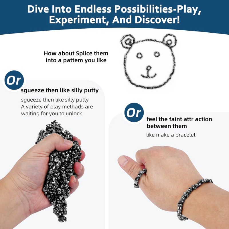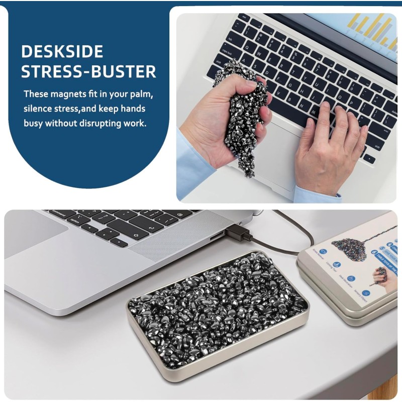 - 【Fidget Toys for Anxiety】Each set of fidget toys has over 550 ferrite stones in a metal tin. You can gab the right account according to your hands, mash ‘em, mold ‘em, stack ‘em, Or make various shapes. These desk toys can not only effectively improve concentration, but also effectively relieve stress and anxiety. When you need to deal with boring occasions, just put them in the palm of your hand to relieve irritability and boredom.
